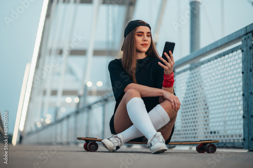 Young woman sitting on her longboard and using a smartphone while on the bridge