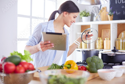 cooking, woman, kitchen, soup, cook, pan, young, stove, apron, female, pot, standing, homemaker, meal, vegetable, happy, beautiful, girl, spoon, chef, people, person, food, caucasian, home