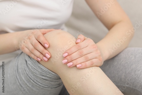 Young woman suffering from pain in knee on sofa at home, closeup