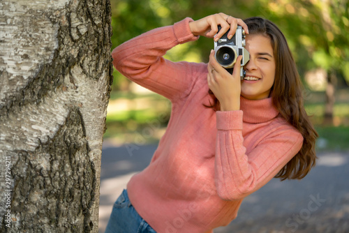 Young woman taking a picture photo with old style camera outdoor in the park.