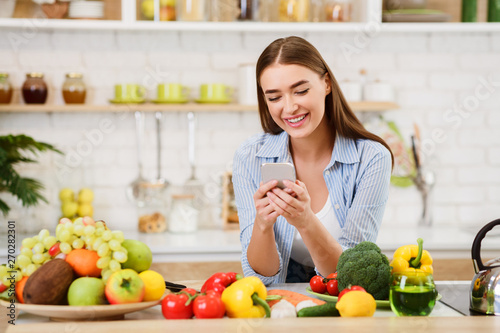 free space, domestic, lifestyle, food, messaging, mobile phone, standing, kitchen, holding, healthy, meal, adult, copy space, fresh, vegetable, eating, indoor, mid, hair, cooking, smiling, mobile phone, culinary, happy, preparing, preparation, female, stove, life, leisure, house, texting, touching, technology, fruit, cook, smartphone, dialling, typing, caucasian, text, home, health food
