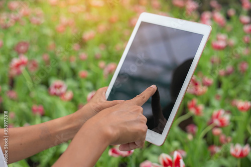 Young Woman Using or Playing Tablet in Garden.