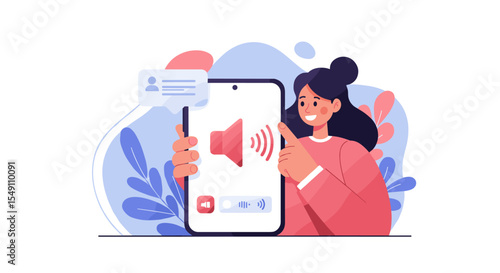 voice, command, smartphone, digital, technology, interaction, woman, illustration, communication, device, modern, app, sound, notification, message, interface, screen, people, character, user, design, vector, art, floral, colourful, user-friendly, tech, vibrant, innovation, social