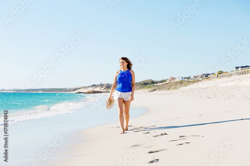 girl, beach, summer, walk, walking, woman, young, sea, water, ocean, beauty, beautiful, vacation, smile, sun, white, health, sky, happy, hair, light, 1, attractive, people, caucasian, healthy, blue, nature, fun, travel, sand, female, face, outdoors, relax, lovely, natural, adult, freedom, portrait, cute, cheerful, pretty, bikini, tan, swimwear, tropical, body, person, fresh
