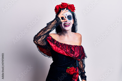 Young woman wearing mexican day of the dead makeup doing ok gesture with hand smiling, eye looking through fingers with happy face.