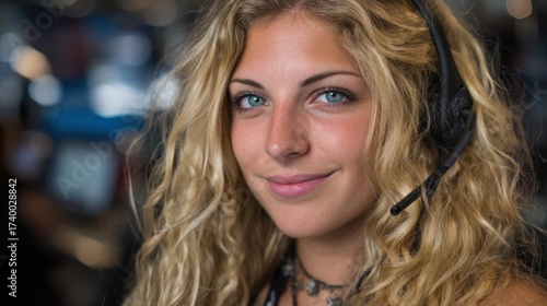 Young woman with curly blonde hair wearing a headset, smiling in a professional office environment