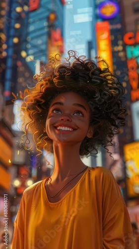 Young woman with curly hair is smiling and looking up at the city lights in wonder. The warm glow of the city lights illuminates her face and creates a magical atmosphere