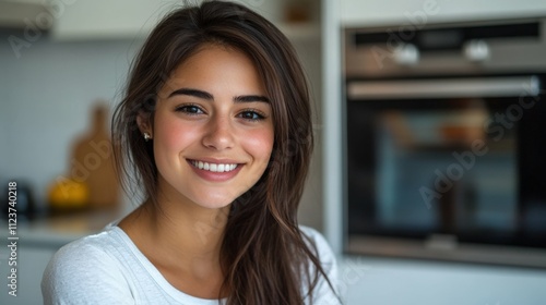 Young woman with dark hair sitting by a white modern kitchen smiling with built-in oven cabinet in the background minimalistic design natural daylight