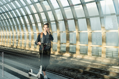 young, woman, electric, scooter, mobile phone, phone, train, station, caucasian, alone, 1, people, lifestyle, modern, hearing, call, wireless, standing, day, commuter, journey, casual attire, commuting, looking away, smartphone, outdoors, brown hair, accessibility, carrying, blouse, backpack, urban, travel, telecom, german, connection, mobility, platform, railroad station, technology, talking, on the phone, communication, listening, mobile phone