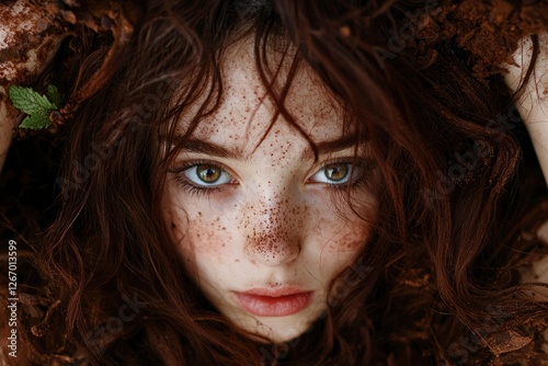 woman, freckle, timberland, dreamy, portrait, young, beauty, face, girl, looking, model, eye, hair, female, red, beautiful, skin, natural, head, person, people, fashion, lifestyle, care, nature, attractive, closeup, adult, style, pretty, youth, expression, cosmetic, innocence, elegance, wellness, healthy, sensual, dream, spring, summer, fresh, foliage, mood