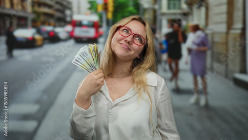 Young woman with glasses smiling and holding romanian currency on a busy city street creates a vibrant scene blending wealth and urban life outdoors.