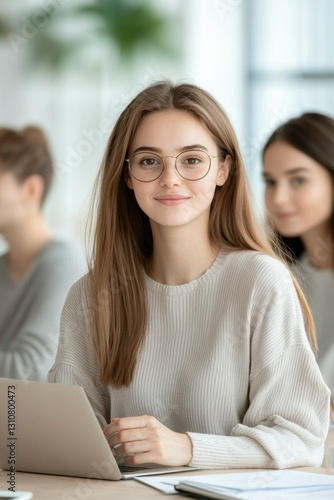 young woman with glasses working on laptop in bright office environment