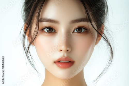 Young woman with natural makeup and smooth skin posing against a light background in a beauty studio during daylight hours