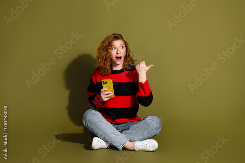 Young woman with red hair sits cross legged on green studio background smiling at her yellow smartphone