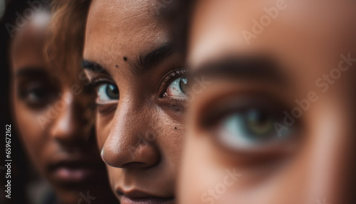 Young women smiling, looking at camera, part of friendship group generated by AI