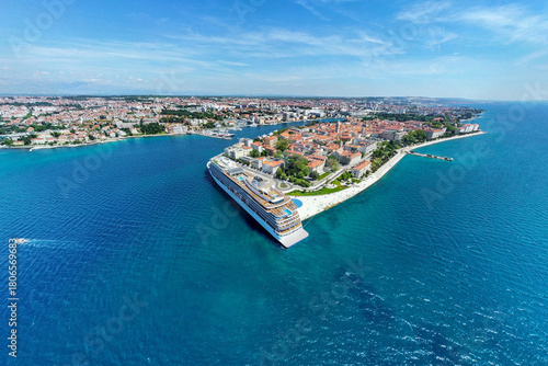 Zadar, Croatia - 18 November 2025: Aerial view of a cruise ship docked beside the historic peninsula, its terracotta rooftops contrasting with the deep azure sea.