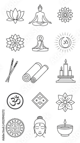 "Zen Yoga & Meditation Symbols" - This collection of line-art doodles features various symbols associated with yoga, meditation, and spiritual well-being. It includes figures in lotus position, lotus