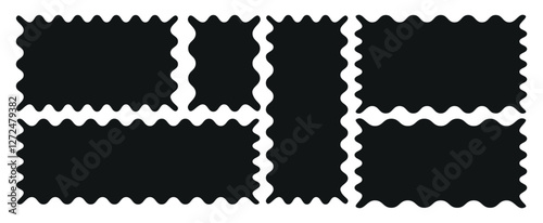 Zigzag frames with wavy edges set. Rectangular curved line shapes. Retro zigzag empty frame border. Text box, tag, stamp label sticker element for design. Vector illustration
