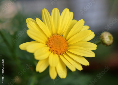 Żółty piekny kwiat z pomarańczowym środkiem, z bliska, widok z góry, tło rozmyte