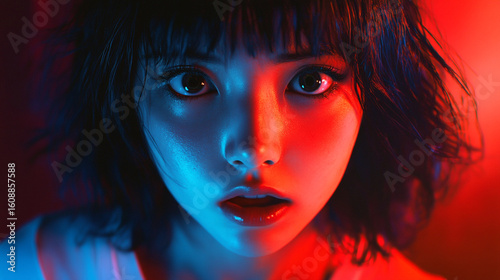japanese, girl, woman, face, zoom, closeup, expression, startle, shocked, emotion, neon, surreal, pink, red, purple, digital, art, female, beauty, eye, lip, skin, hair, glow, light, vibrant, colours, fashion, make-up, mood, intense, dramatic, modern, visual, concept, style, portrait, fantasy, mystery, abstract, bold, creative, design, aesthetic, young, trendy, cool, urban, night